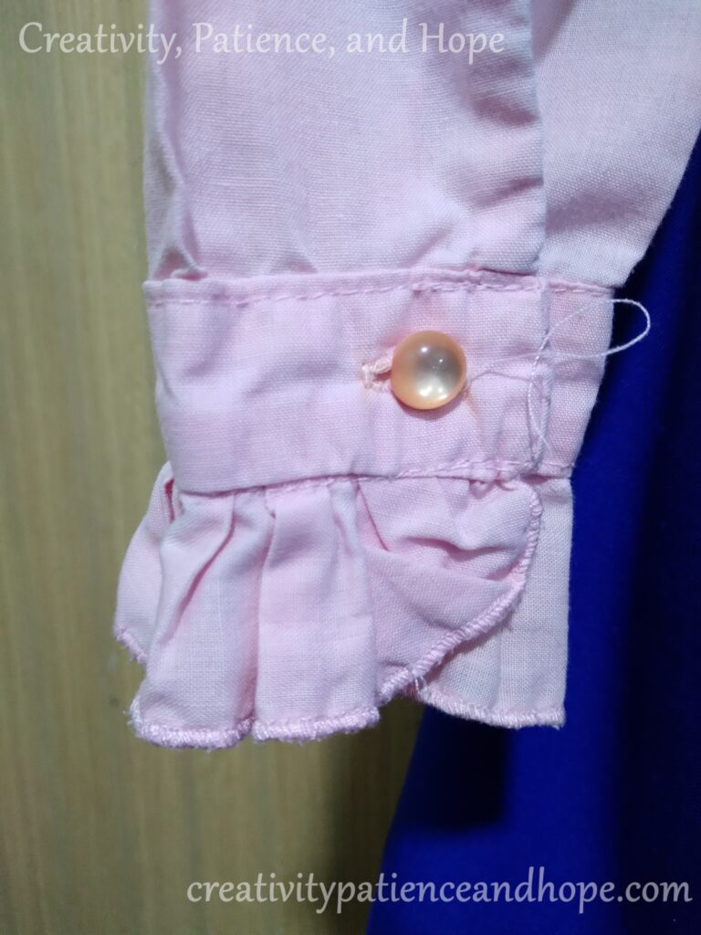 The cuffs also have ruffles sewn in the same way, and a ruffle is sewn in on each side of the button placket.