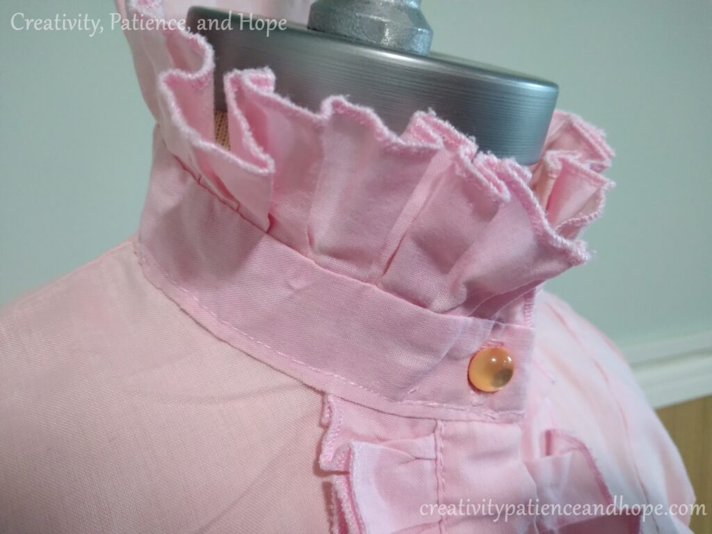 The ruffles have the exposed edge finished with a tight overlock stitch. We all thought it gave it a nice edge accent, and that way she didn’t have to worry about bulkier ways of finishing the edge. To finish it off, the shirt has these shiny rounded pink buttons. She did love those shiny buttons!