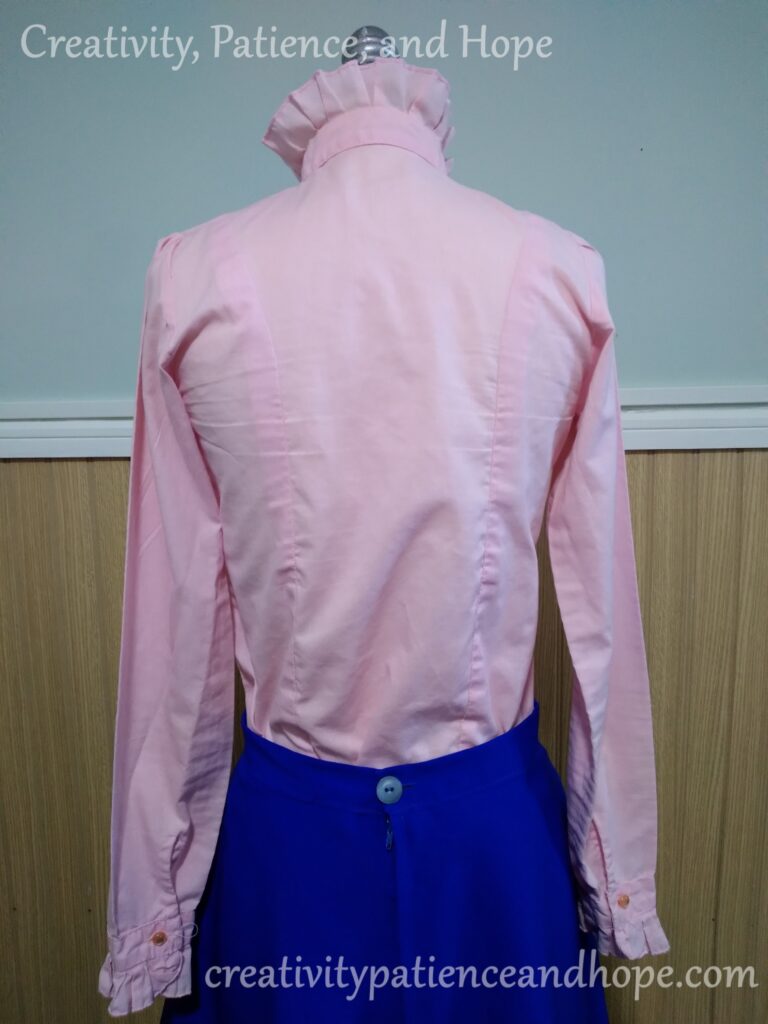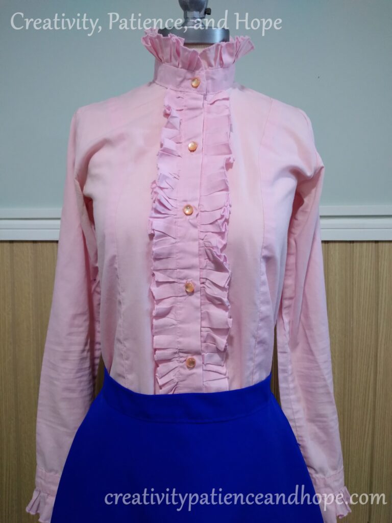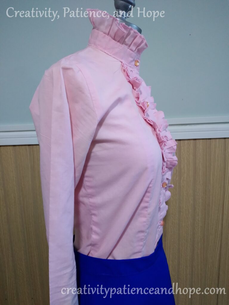 I believe this was one of her favorite shirts that she made. She was very excited when she was working on it, and seemed very happy with it when she finished. It featured often in her ensembles, and I feel like the ruffles suited her well.